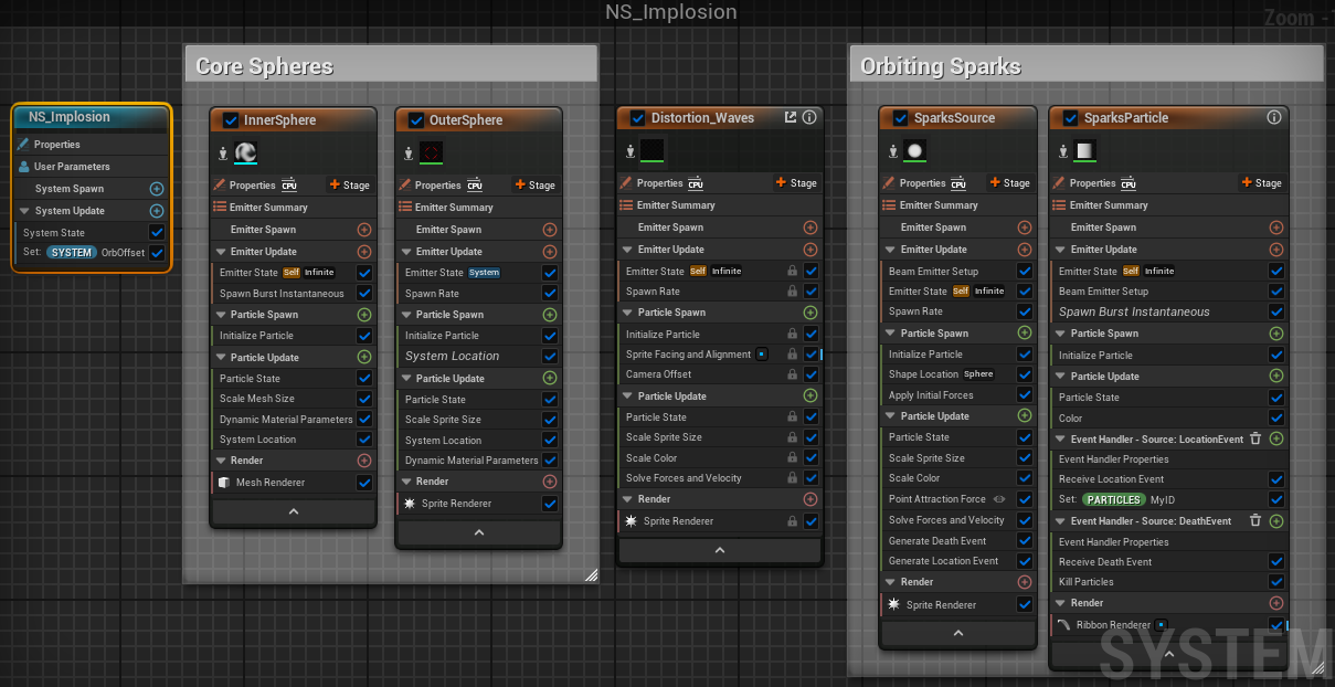 Highlighted on the right, you can see the Energy Core’s explosion sound, build with preset and bespoke synths as well as supporting samples. The audio is synced to the niagara vfx and can be played both forwards and in reverse in order to fit its gameplay affordances.