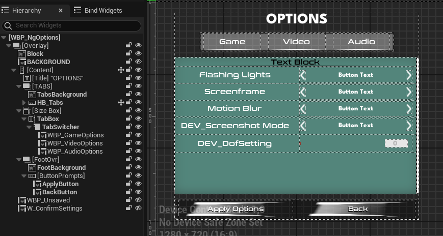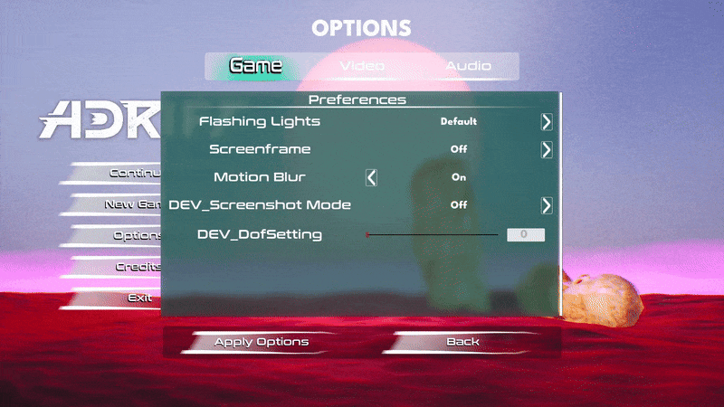 In a minimalistic game without a lot of UI, the options menu ends up being the most complex to set up. With a hierarchy of nested widgets, changing, applying, (auto-)undoing and saving changes you end up with quite a lot of data being passed around. While it’s nothing revolutionary, ADRIFT’s UX makes sure players close the menu with the desired settings applied and saved and can benefit from auto-reverting changes if newly applied options cause any issues.