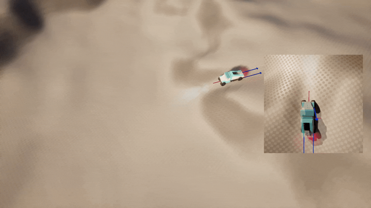 As we’re driving an all-wheel drive vehicle, each wheel will also add an additional force based on the player’s throttle and steering input. The base acceleration force is being multiplied by a value from a float curve based on the current velocity. This allows us to achieve a natural feeling track that’s controllably at low speeds and will naturally top out at a max speed without needing to simulate real world physics and also keep it intuitive for the player as a vibey top-down driving game.